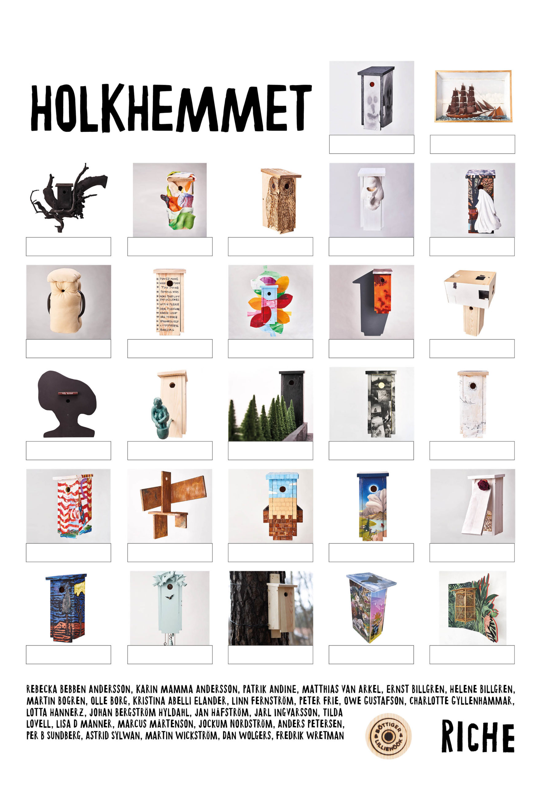 Välkommen att botanisera bland 27 tolkningar av Sveriges mest framstående konstnärer. Alla har haft samma förutsättningar och utgått från en och samma fågelholk. Varje objekt är unikt och signerat och samtliga presenteras anonymt. Avsikten med detta är att de som är intresserade av en holk ska välja med hjärtat och inte med något annat.