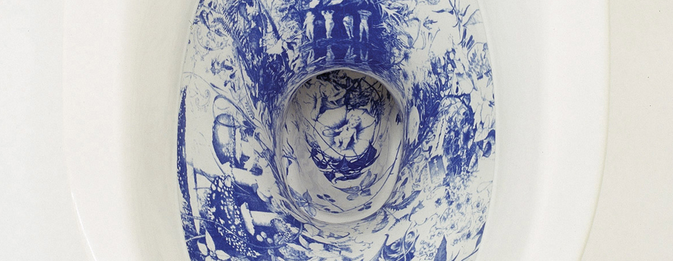 Men i botten ligger ett spädbarn och ovanför står tre figurer och klär av sig. Bland den tillsynes vackra växtligheten, som vid närmare betrak- telse visar sig vara ogräs, ligger rakblad. Estetiken döljer, för att sedan skapa en spännande kollision mellan dystopi och utopi, mellan det sköna och det smutsiga, det trygga och det farliga. Världen är inte vad den verkar. En grym realism har trängt in i sagolandskapet.