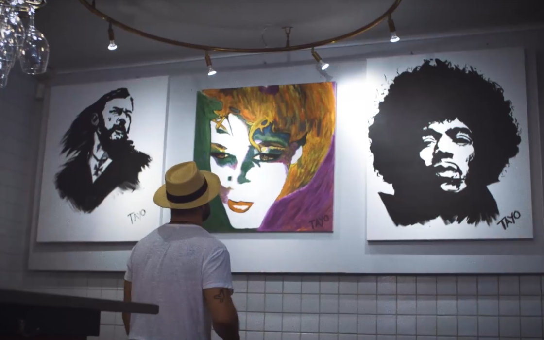 Tayo Hendrix konst är mestadels handmålad med lite digital som kastas i mixen. Verken finns som original och begränsade utgåvor. Tayo tipsar om att när du tittar på verken så kan du göra det tillsammans med musiken Tayo skapade speciellt för den här installationen (April Love / Tayo Irvine Hendrix)